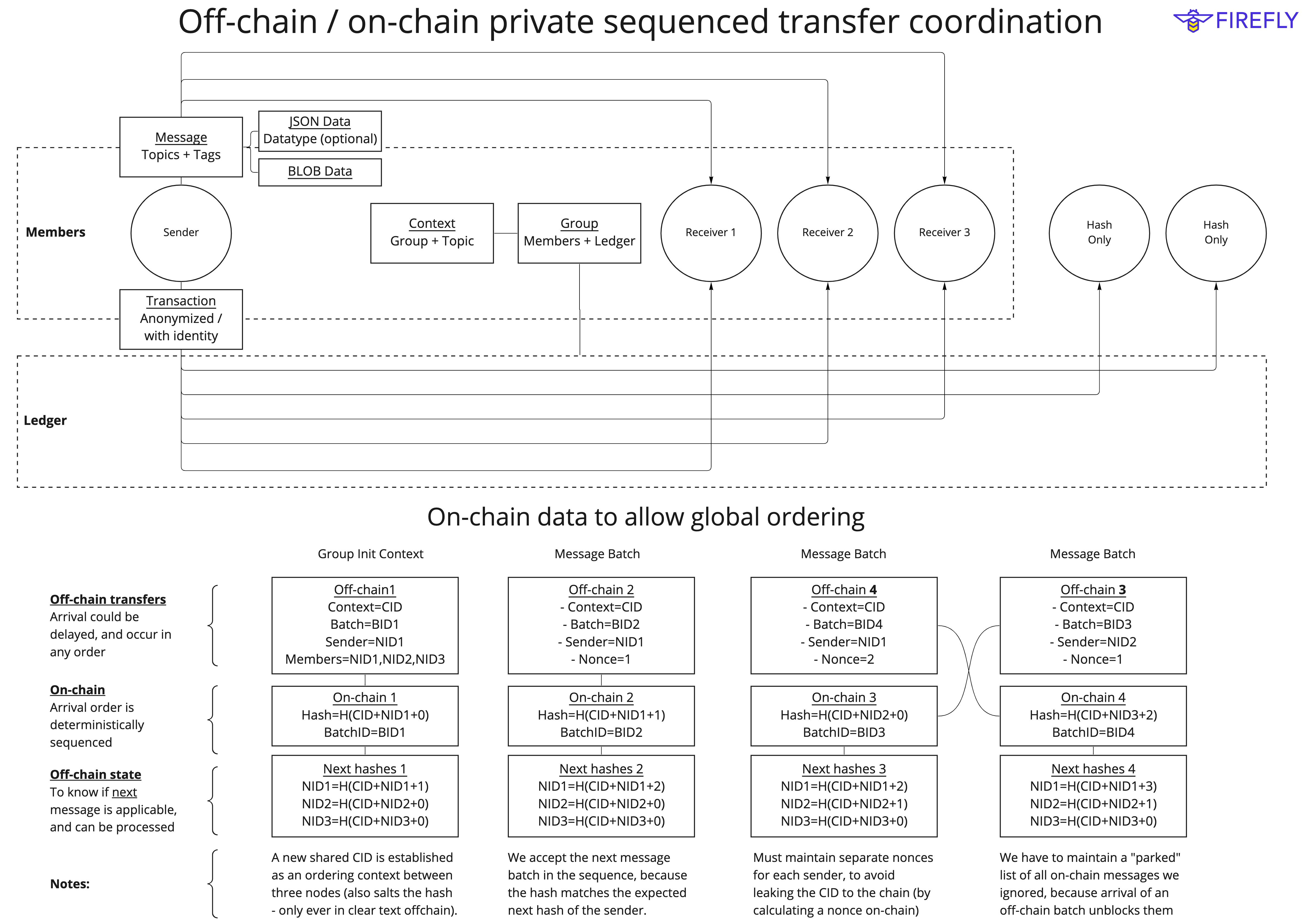 The mechanism that keeps data private and ordered, without leaking data to the blockchain, is summarized in the below diagram.
