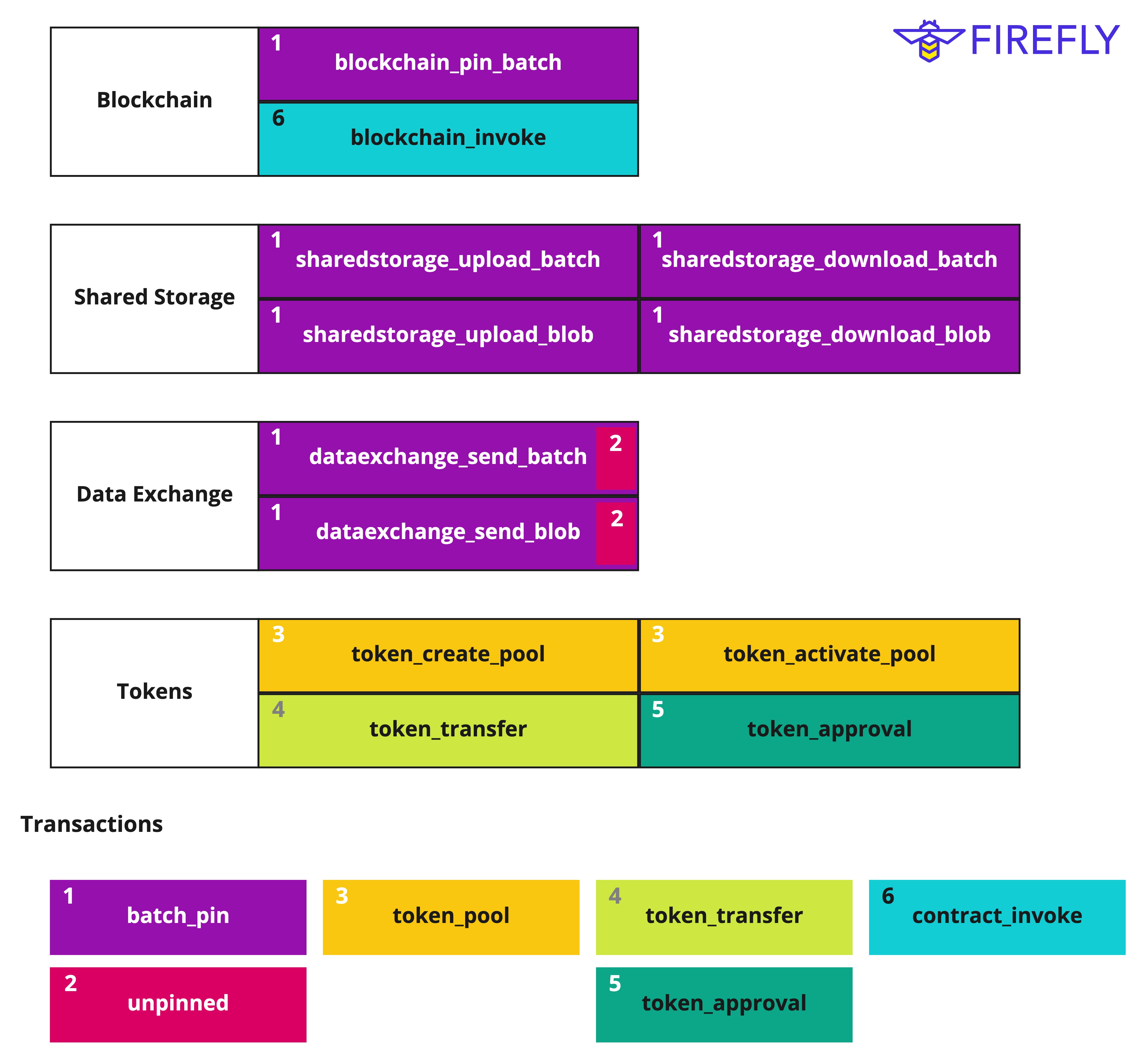 The diagram below shows the different types of operation that are performed by each FireFly plugin type. The color coding (and numbers) map those different types of operation to the Transaction types that include those operations.