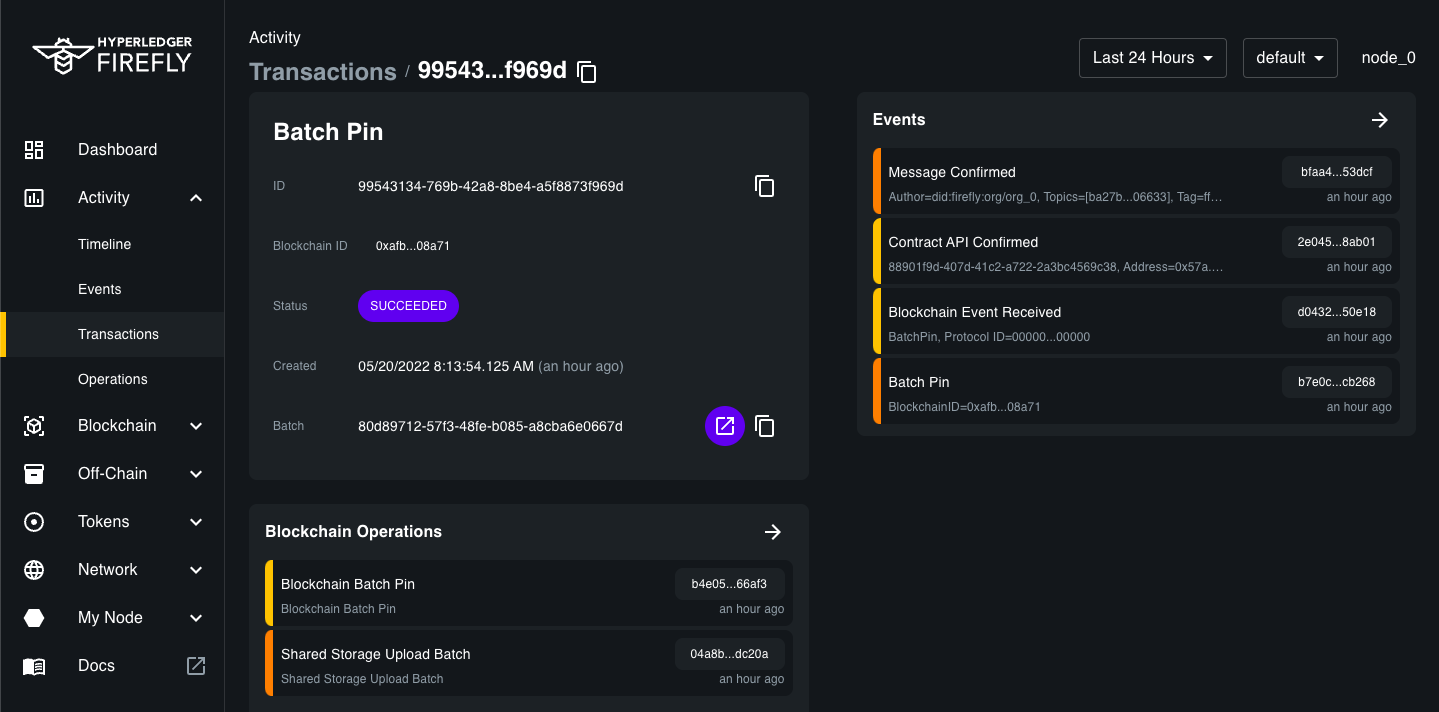 The below screenshot from the FireFly Explorer nicely illustrates how multiple operations and events are associated with a FireFly transaction. In this example, the transaction tracking is pinning of a batch of messages stored in IPFS to the blockchain.